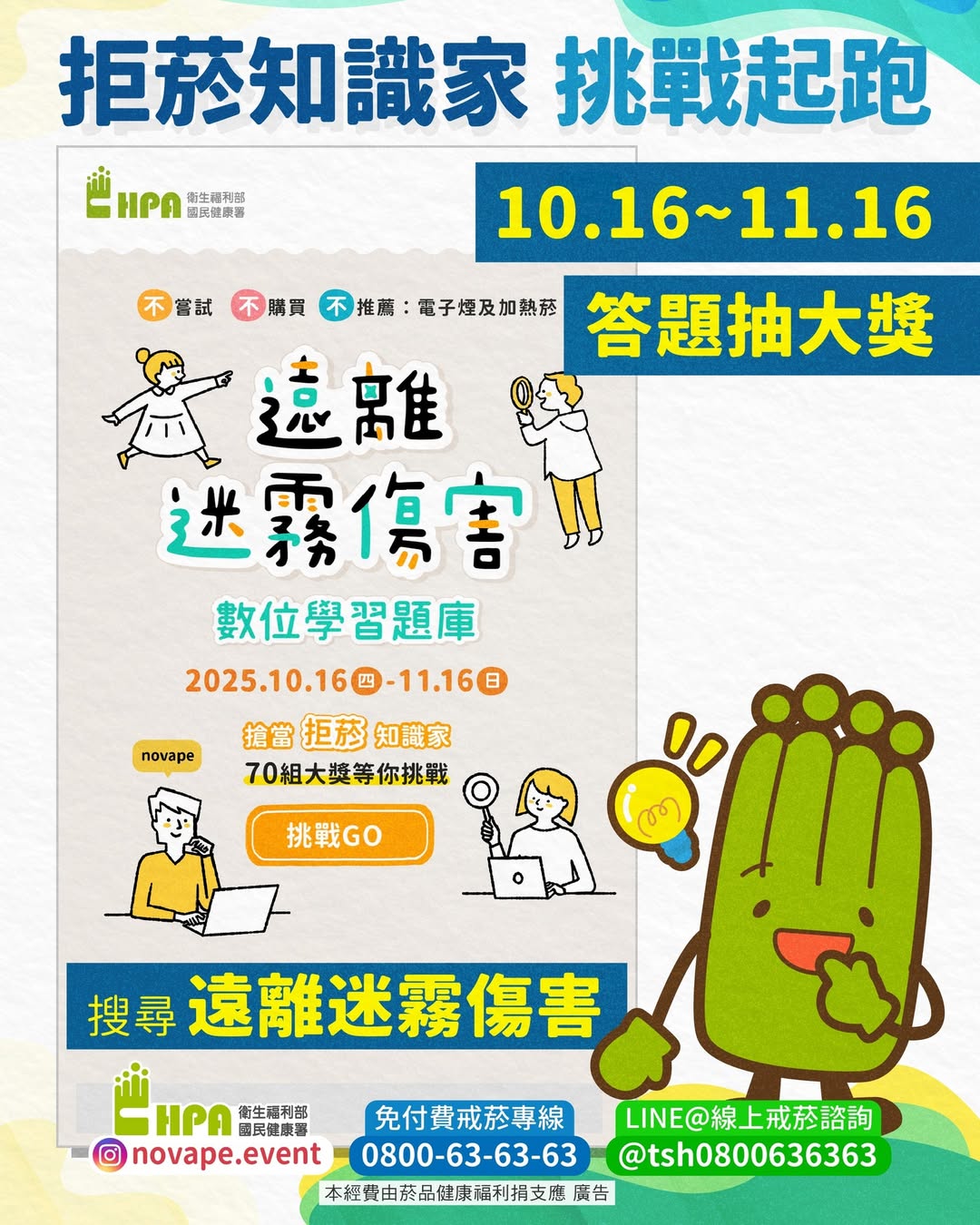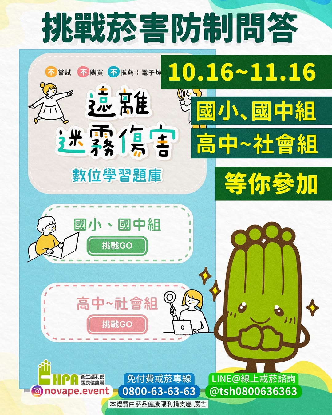 🎁最新一年的國民健康署-遠離迷霧傷害活動開始囉!本次的活動方式是「挑戰拒菸知識5題、只要答對4題以上就可以答抽大獎喔!」,感覺很簡單嗎?每組(國小、國中組 / 高中~社會組)都有70個大獎等你挑戰喔。
